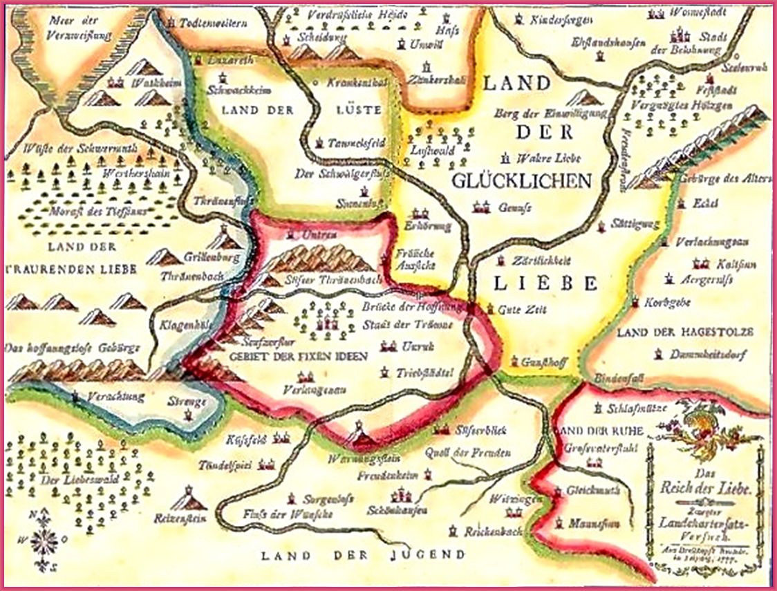 übertreten sollten. Dieses Hauptgebiet grenzt gegen Morgen an das Land der glücklichen Liebe, gegen Abend an das Land der traurenden Liebe, gegen Mitternacht an das Land der Lüste. Seine vornehmsten Städte sind die Stadt der Träume, Triebstadt, Verlangen und Unruh.